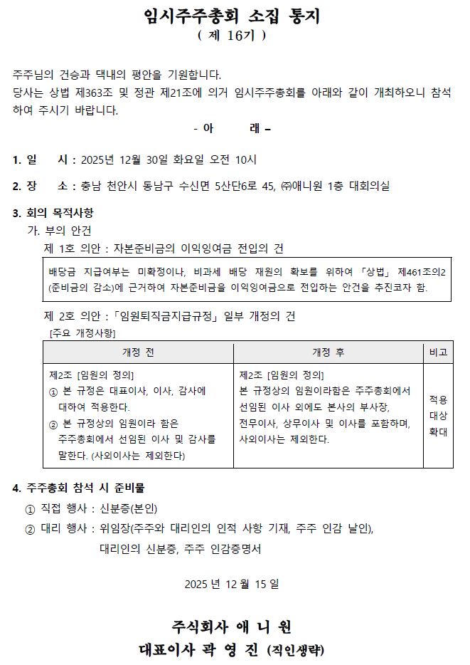 제 16기 임시주주총회 소집 통지('2025.12.30)